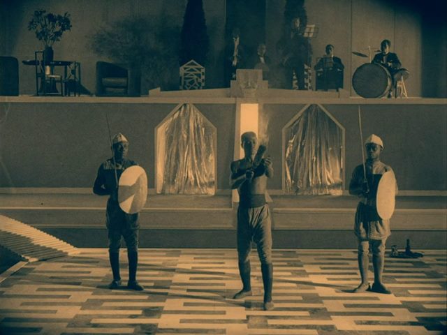 While L’Herbier’s more celebrated follow-up L’Argent is loaded with energetic camera movements, it is a film that seems to have been composed by a gymnast. L’inhumaine, on the other hand, is controlled by a steadier hand, most likely the work of an architect. The space of Claire Lescot’s mansion is somewhat fictitious, her privacy is housed in an area that comes out of a fairy tale. Her fortress is one of a solitude, visibly marked as separate from the confines of the urban. Yet, within her lies all of the things that occupy the politics of the city: capitalism, colonization, and the body all partake in a dance (literally) in Claire’s fortress. Black servants perform entertainment for her as rich men bid for access towards her sexuality. Despite the negotiations that are happening all over her body, Claire is able to maintain some control. When the camera shifts to the top of the ceiling, her performance space takes on the appearance of a chess board, which complimented by the paper mache servants, imply that can manipulate things to her desires at will.